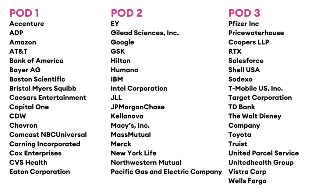 All 50 BOTB Corporations are divided into three (3) pods for the Awards Luncheon. During the Awards program, your corporation will be recognized from the main stage in your pod group. Following the awards ceremony, your team will queue for photos in your pod group. Your pod group assignment can be found in the chart below.