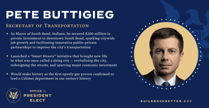 “Mayor Pete Buttigieg is a patriot and a problem-solver who speaks to the best of who we are as a nation…This position stands at the nexus of so many of the interlocking challenges and opportunities ahead of us. Jobs, infrastructure, equity, and climate all come together at the DOT, the site of some of our most ambitious plans to build back better. I trust Mayor Pete to lead this work with focus, decency, and a bold vision — he will bring people together to get big things done.”